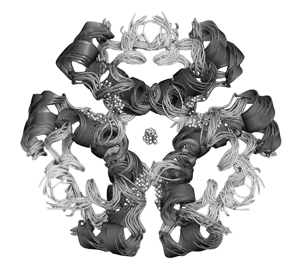 Tegning af seks humane insulinmolekyler forbundet i en hexamer (R6-form).
